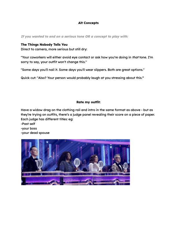 I pitched a series about widows going to work; if they were able to take any time off, did they want to go back to work, how they now viewed their careers, and how they coped being back into the swing of things. We did a series of interviews which I edited into a series. However the dark humor heart was missing. I decided to pitch a concept on ‘what not to wear to work’. The idea was picked up and I moved into fleshing out initial concepts.